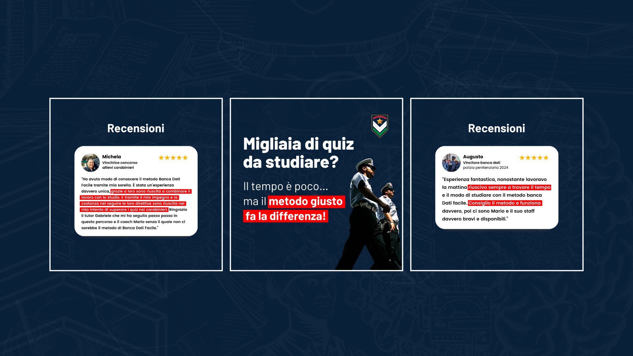 Il posizionamento iniziale era solido nel prodotto ma debole nella comunicazione: BancaDatiFacile non si distingueva dai competitor come Nissolino Corsi o Concorsi Militari Academy, entrambi noti per comunicazioni molto corporate e garanzie “Soddisfatti o Ripreparati”.